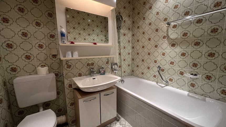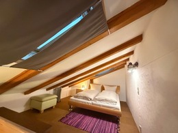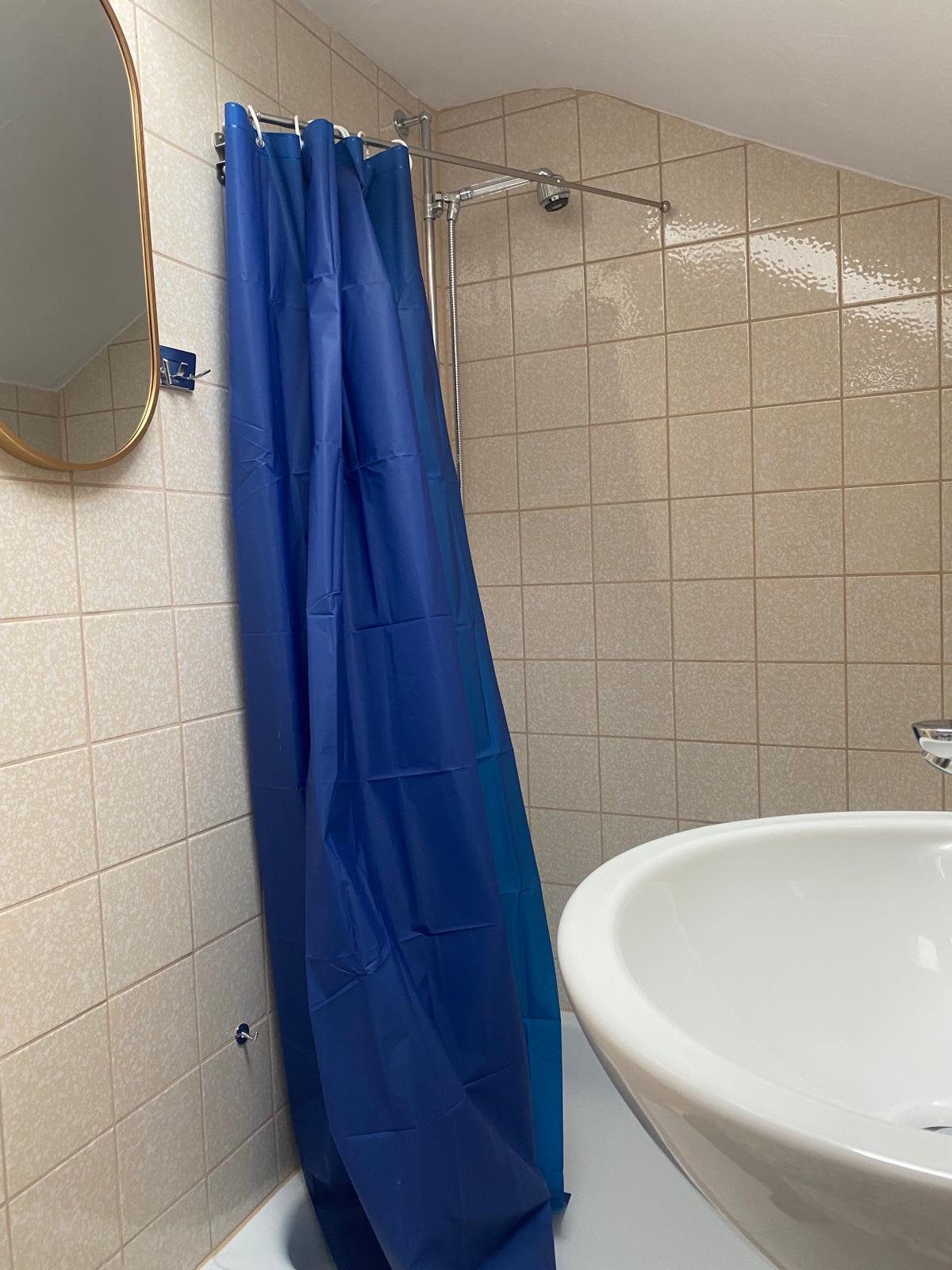 Das Schlafzimmer ist behaglich eingerichtet und schenkt Ihnen erholsame Nächte. Das Badezimmer ist sehr klein, liegt in der Mansarde und ist bewusst kompakt gehalten. Die Dusche ist durch die Dachschräge in der Stehhöhe auf etwa 175 cm begrenzt mit Vorhang. – funktional und zweckmäßig, aber nicht luxuriös.